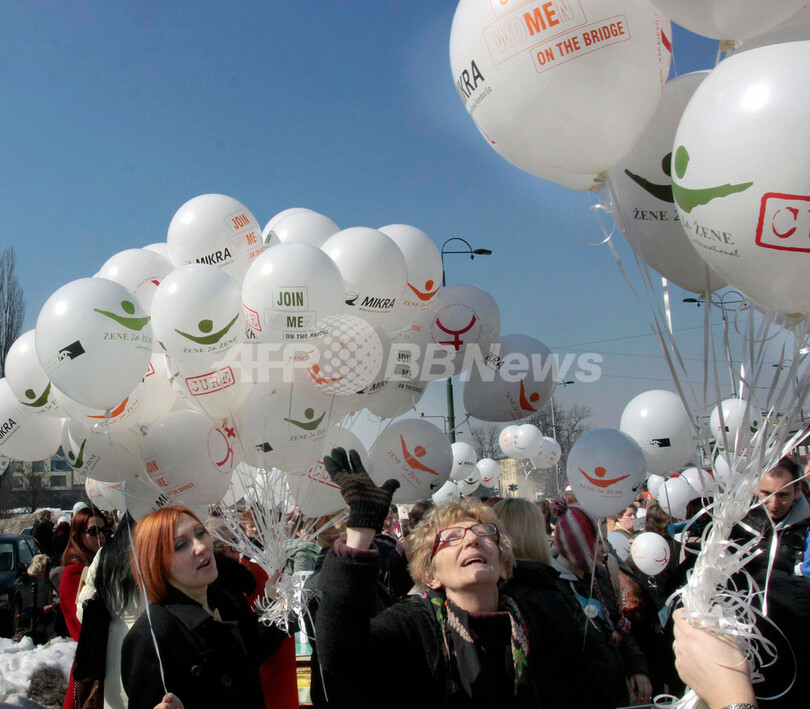 写真はボスニア・サラエボ(Sarajevo)で、風船を空に放つ女性ら(2012年3月8日撮影)。(c)AFP/ELVIS BARUKCIC