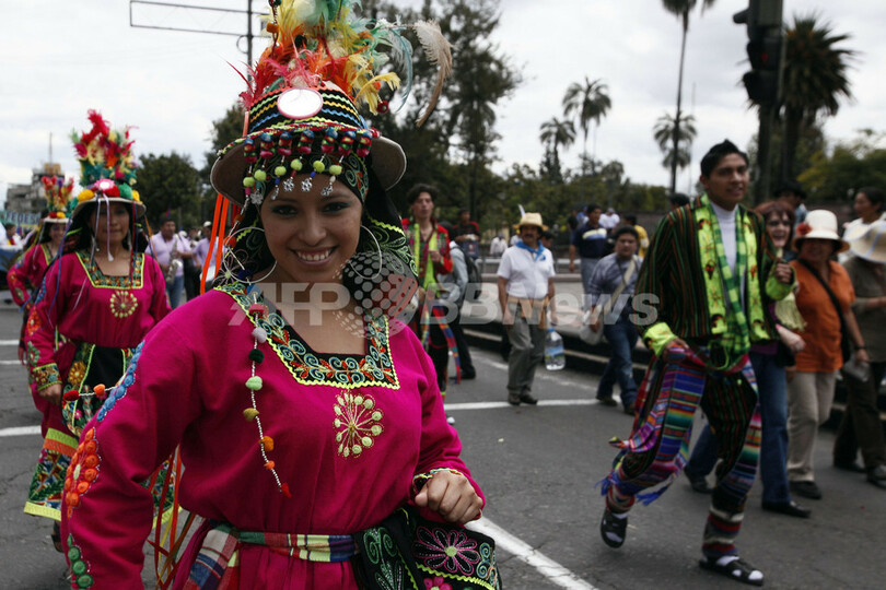 写真はエクアドル・キト(Quito)で、民族衣装でデモ行進する女性(2012年3月8日撮影)。(c)AFP/PABLO COZZAGLIO