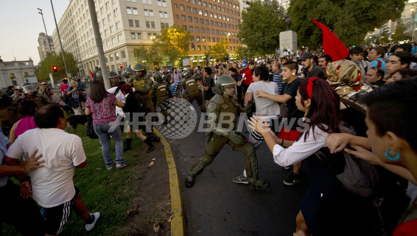 写真はチリの首都サンティアゴ(Santiago)で、警官隊と衝突するデモ隊(2012年3月8日撮影)。(c)AFP/MARTIN BERNETTI