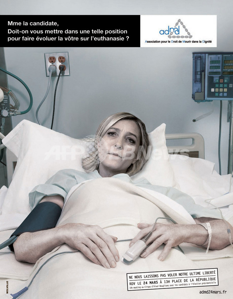 ニュース ライフ サルコジ大統領が死の床に…?安楽死反対に抗議広告 2012年3月9日 15:06 発信地:フランス [ ヨーロッパ フランス ] このニュースをシェア ‹ › ❮ 3/4 ❯ 「尊厳死の権利のための協会」(ADMD)による極右政党、国民戦線(FN)のマリーヌ・ルペン(Marine Le Pen)候補者が病床に横たわる合成写真(2012年3月6日公開)。(c)AFP/ADMD 画像作成中 ! 【3月9日 AFP】仏「尊厳死の権利のための協会」(ADMD)が6日、ニコラ・サルコジ(Nicolas Sarkozy)大統領を始め、今春の大統領選挙の候補者たちが病院のベッドに横たわっている合成写真を公開した。写真には、「こうならないと安楽死に賛成できないのですか」という抗議メッセージが添えられている。(c)AFP ライフ 一覧へ> メディア・報道関係・法人の方向け 写真・動画 購入のお問合せ>