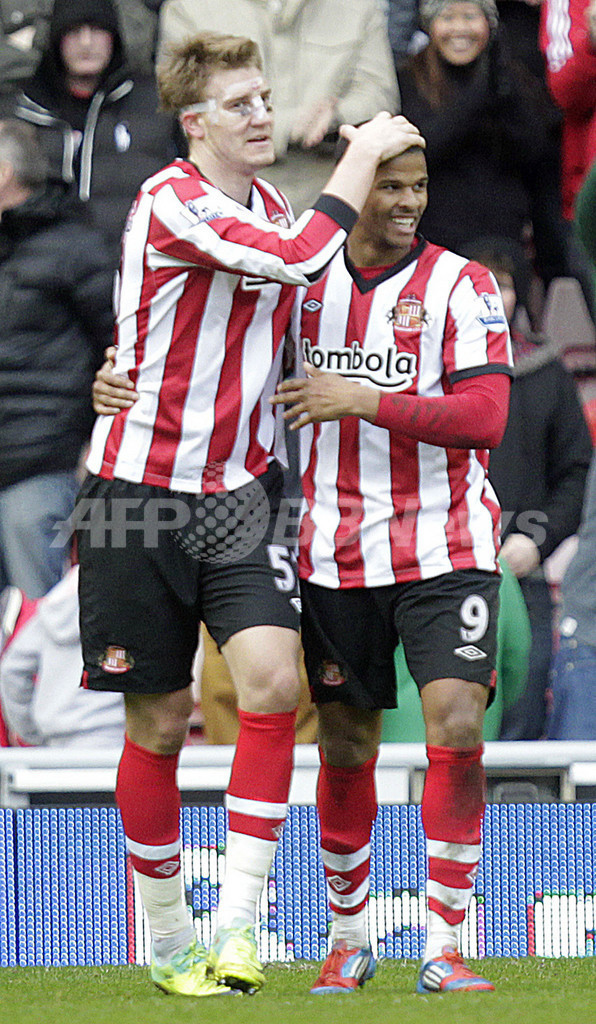 後半11分に先制点を挙げ、チームメイトのフレイザー・キャンベル(Fraizer Campbell)と喜びを分かち合うサンダーランドのニクラス・ベントナー(Nicklas Bendtner、2012年3月10日撮影)。(c)AFP/GRAHAM STUART