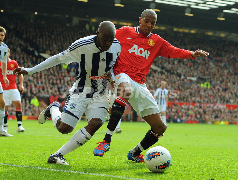 WBAのユスフ・ムルンブ(Youssuf Mulumbu、左)とボールを競るマンチェスター・ユナイテッドのアシュリー・ヤング(Ashley Young、2012年3月11日撮影)。(c)AFP/ANDREW YATES