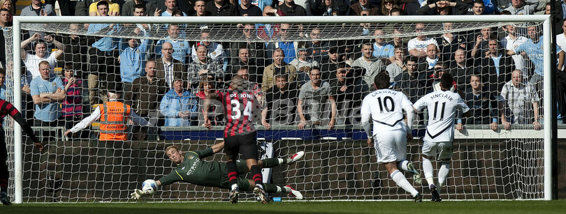 敵地リバティー・スタジアム(Liberty Stadium)でロベルト・マンチーニ(Roberto Mancini)監督率いるシティは、前半6分にGKジョー・ハート(Joe Hart)がウェイン・ルートリッジ(Wayne Routledge)にファウルを犯したとしてスウォンジー・シティにPKを献上したものの、スコット・シンクレア(Scott Sinclair)のシュートはハートがセーブした。