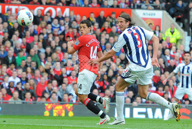 WBAのヨナス・オルセン(Jonas Olsson、右)とボールを競るマンチェスター・ユナイテッドのハビエル・エルナンデス(Javier Hernandez、2012年3月11日撮影)。(c)AFP/ANDREW YATES