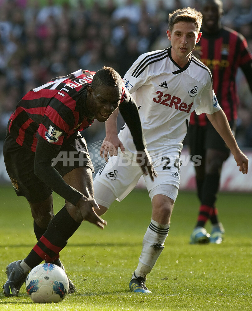 マンチェスター・シティのマリオ・バロテッリ(Mario Balotelli、左)とボールを競るスウォンジー・シティのジョー・アレン(Joe Allen、2012年3月11日撮影)。(c)AFP/BEN STANSALL