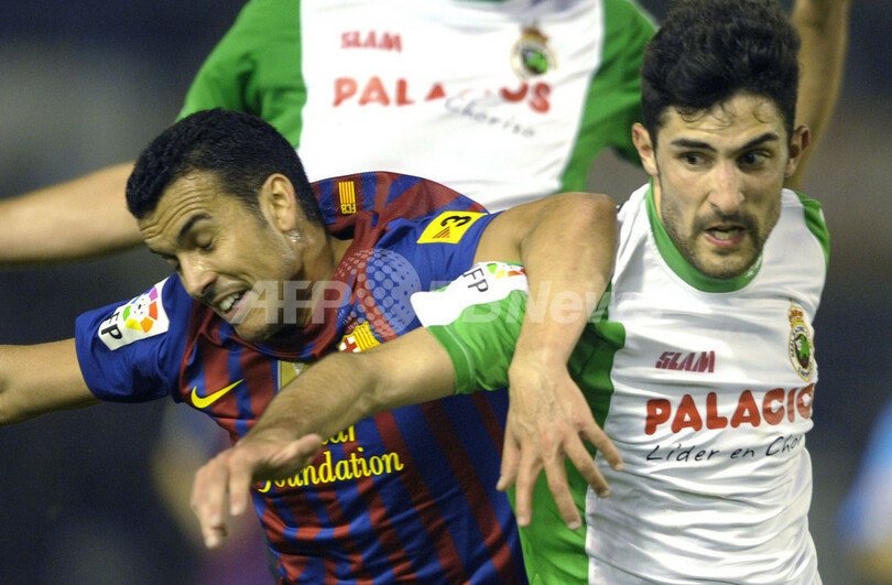 ボールを競るFCバルセロナのペドロ・ロドリゲス・レデスマ(Pedro Rodriguez Ledesma)とラシン・サンタンデールのアルバロ・ゴンサレス(Alvaro Gonzalez、2012年3月11日撮影)。(c)AFP/MIGUEL RIOPA
