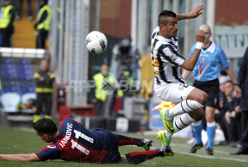 ジェノアのボシュコ・ヤンコヴィッチ(Bosko Jankovic、左)のタックルを受けるユベントスのアルトゥーロ・ビダル(Arturo Vidal、2012年3月11日撮影)。(c)AFP/FABIO MUZZI