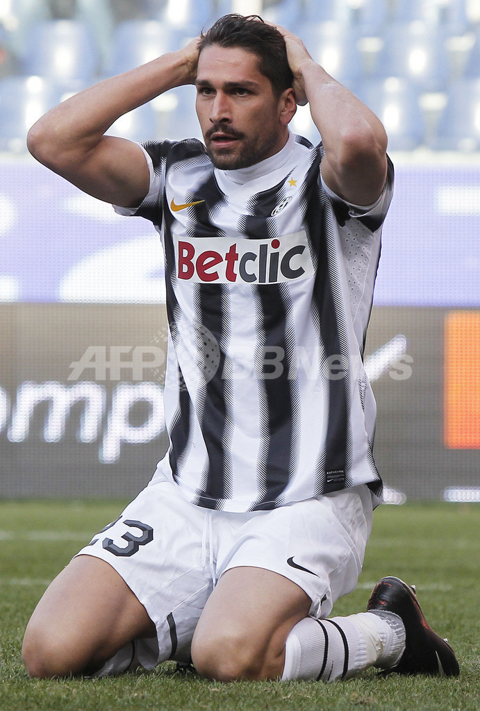 好機を逸し、頭を抱えるユベントスのマルコ・ボリエッロ(Marco Borriello、2012年3月11日撮影)。(c)AFP/FABIO MUZZI