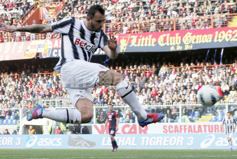 シュートを放つユベントスのシモーネ・ペペ(Simone Pepe、2012年3月11日撮影)。(c)AFP/FABIO MUZZI