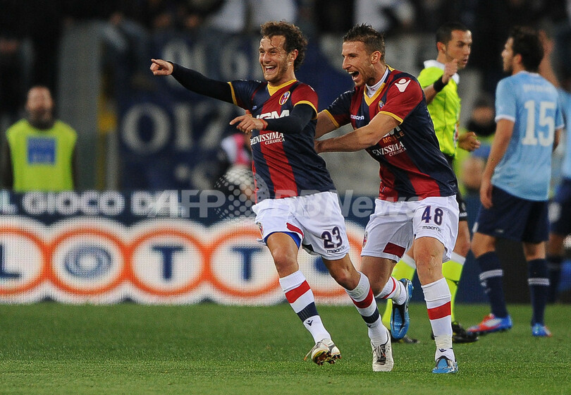 前半28分に追加点を奪い、チームメイトのマッテオ・ルビン(Matteo Rubin、右)と歓喜するボローニャのアレッサンドロ・ディアマンティ(Alessandro Diamanti、2012年3月11日撮影)。(c)AFP/ANDREAS SOLARO