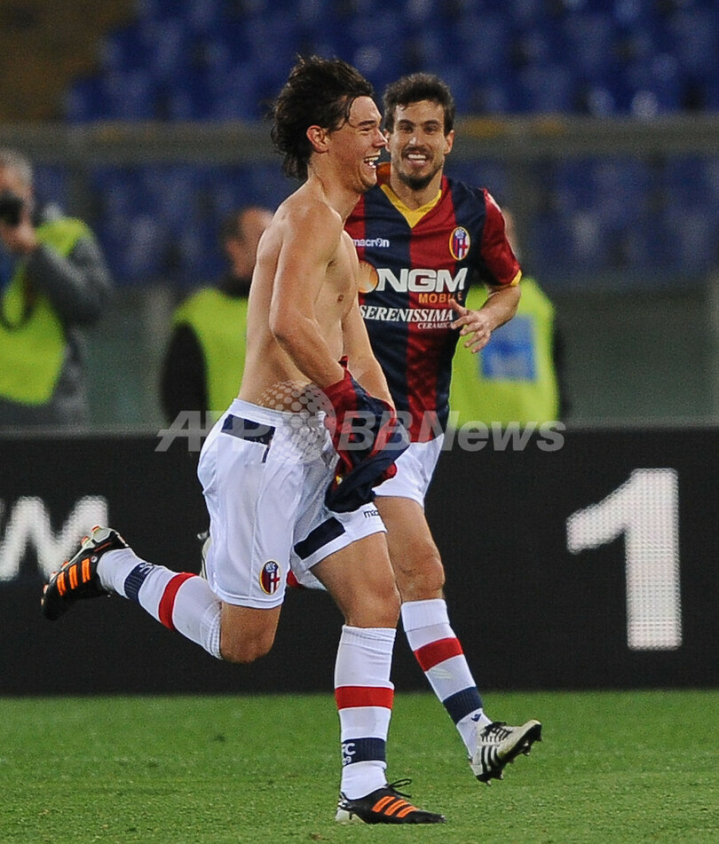後半15分に追加点を挙げ、歓喜するボローニャのレネ・クルヒン(Rene Krhin、2012年3月11日撮影)。(c)AFP/ANDREAS SOLARO