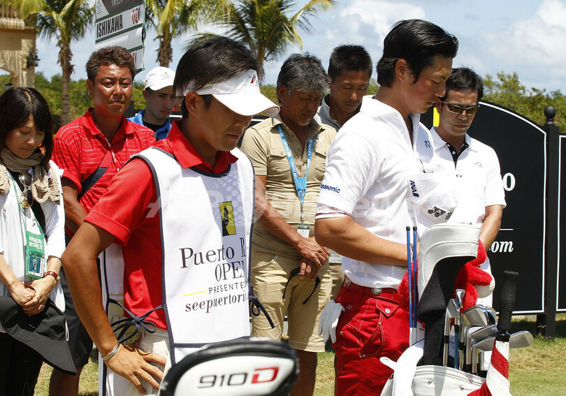 ラウンド開始前にキャディーの加藤大幸氏(Hiroyuki Kato、左)とともに東日本大震災の犠牲者に黙とうする石川遼(2012年3月11日撮影)。(c)AFP/Getty Images/Michael Cohen
