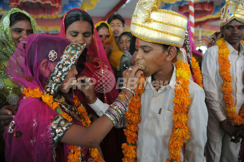 色鮮やかなサリーの衣装に身を包んだ8人の花嫁は、全員18歳かそれより少し年上。太鼓の音が大きく鳴り響く中、華やかなターバンをまとった花婿たちと式を挙げた。結婚式と同時に18歳未満の少女たち12人の婚約式も行われたが、3件の婚約については相手の少年たちが姿を現さなかったため中止となった。