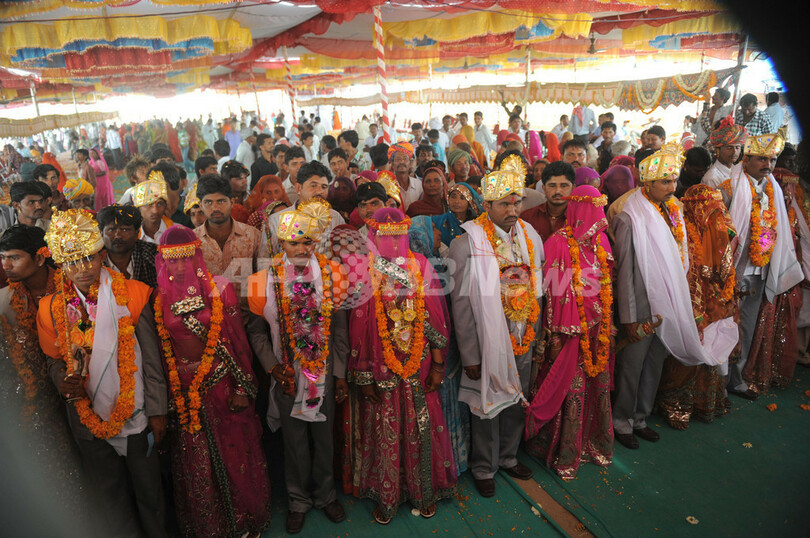 色鮮やかなサリーの衣装に身を包んだ8人の花嫁は、全員18歳かそれより少し年上。太鼓の音が大きく鳴り響く中、華やかなターバンをまとった花婿たちと式を挙げた。結婚式と同時に18歳未満の少女たち12人の婚約式も行われたが、3件の婚約については相手の少年たちが姿を現さなかったため中止となった。