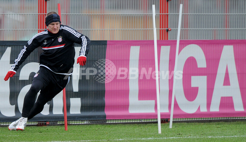調整を行うバイエルン・ミュンヘンのバスティアン・シュバインシュタイガー(Bastian Schweinsteiger、2012年3月12日撮影)。(c)AFP/