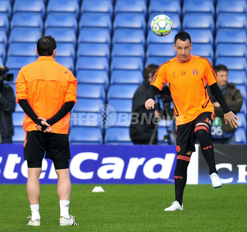 調整を行うチェルシーのフランク・ランパード(Frank Lampard、左)とジョン・テリー(John Terry、2012年3月13日撮影)。(c)AFP/GLYN KIRK