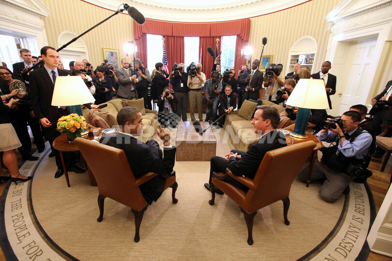 写真は、ホワイトハウスの大統領執務室(Oval Office)で会談するバラク・オバマ米大統領(左)とデービッド・キャメロン英首相(右、2012年3月14日撮影)。(c)AFP