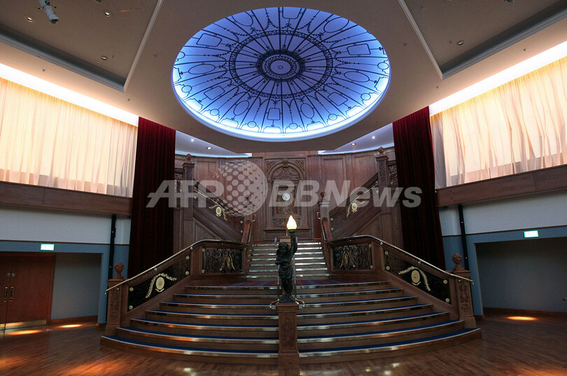 写真は、センター内に再現されたタイタニック号船内の大階段(2012年3月13日撮影)。(c)AFP/PETER MUHLY