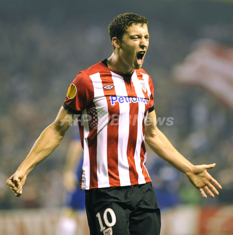 後半20分にチーム2得点目を挙げて歓喜するアスレティック・ビルバオのオスカル・デ・マルコス(Oscar de Marcos、2012年3月15日撮影)。(c)AFP/JAVIER SORIANO