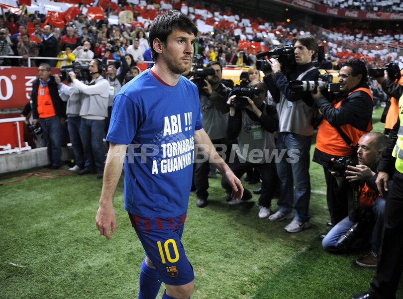 肝移植手術を受けることを発表したチームメイトのエリック・アビダル(Eric Abidal)へのメッセージが記されたシャツを着けて登場するFCバルセロナのリオネル・メッシ(Lionel Messi、2012年3月17日撮影)。(c)AFP/CRISTINA QUICLER