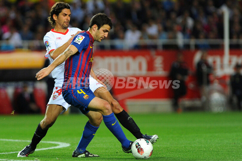 セビージャFCのジュリアン・エスキュデ(Julien Escude)とボールを競るFCバルセロナのセスク・ファブレガス(Cesc Fabregas、2012年3月17日撮影)。(c)AFP/JORGE GUERRERO