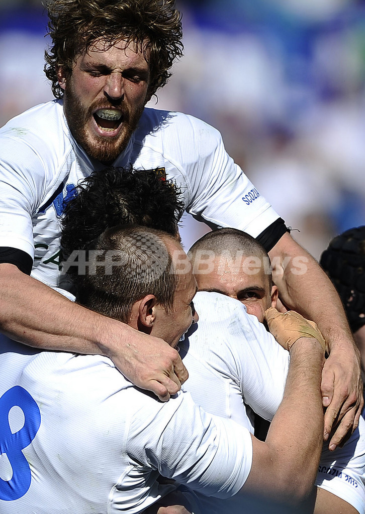 トライを決めたジョヴァンバティスタ・ヴェンディッティ(Giovanbattista Venditti)を祝福するイタリアの選手(2012年3月17日撮影)。(c)AFP/FILIPPO MONTEFORTE