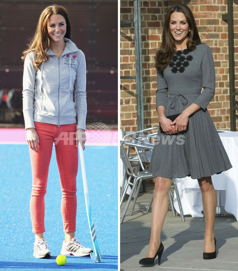 写真左はホッケーを楽しむキャサリン妃。写真右はその数時間後に、ロンドン南部で英皇太子の慈善団体が開いたイベントを公式訪問するキャサリン妃(2012年3月15日撮影)。(c)AFP/CHRIS JACKSON/MIGUEL MEDINA