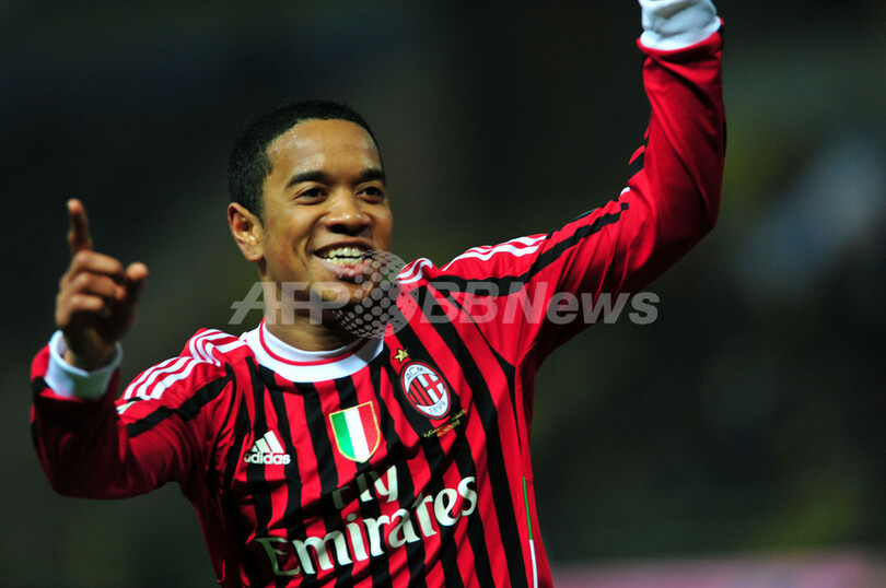 後半10分にチーム2得点目を挙げて歓喜するACミランのウルビー・エマヌエルソン(Urby Emanuelson、2012年3月17日撮影)。(c)AFP/GIUSEPPE CACACE