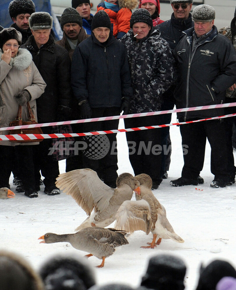 ニュース ライフ こぼれ話 闘鶏…ではなく「闘ガチョウ」、ロシア 2012年3月19日 6:44 発信地:パブロフスク/ロシア [ ロシア・CIS ロシア ] このニュースをシェア ‹ › ❮ 3/4 ❯ ロシア・パブロフスク(Pavlovsk)で開かれた「闘ガチョウ」大会で戦う2羽のガチョウ(2012年3月17日撮影)。(c)AFP/ANDREY SMIRNOV 画像作成中 ! 【3月19日 AFP】ロシア・モスクワ(Moscow)から約450キロ離れたパブロフスク(Pavlovsk)で17日、ガチョウ同士を戦わせる「闘ガチョウ」が開かれた。獣医が参加する全てのガチョウの健康診断を試合前に実施し、試合中の安全にも気を配った。(c)AFP ライフ 一覧へ> メディア・報道関係・法人の方向け 写真・動画 購入のお問合せ>
