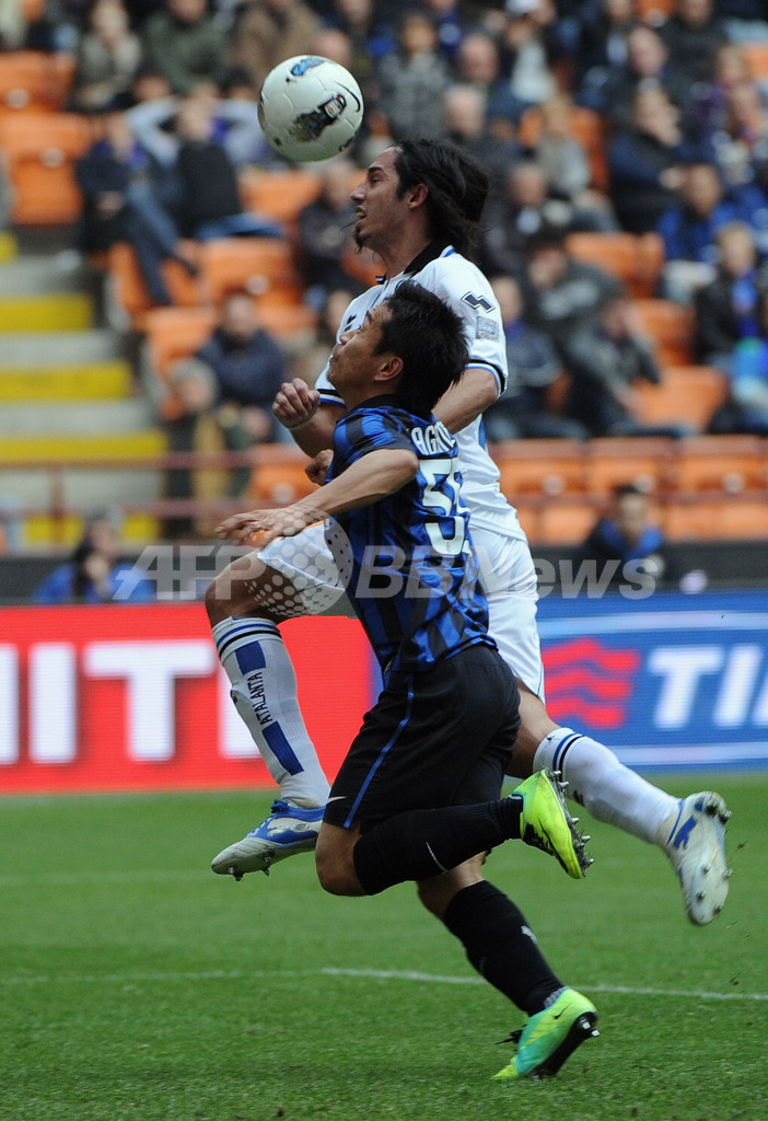 アタランタのマティアス・エセキエル・スケロット(Matias Ezequiel Schelotto)とボールを競るインテルの長友佑都(Yuto Nagatomo、2012年3月18日撮影)。(c)AFP/OLIVIER MORIN