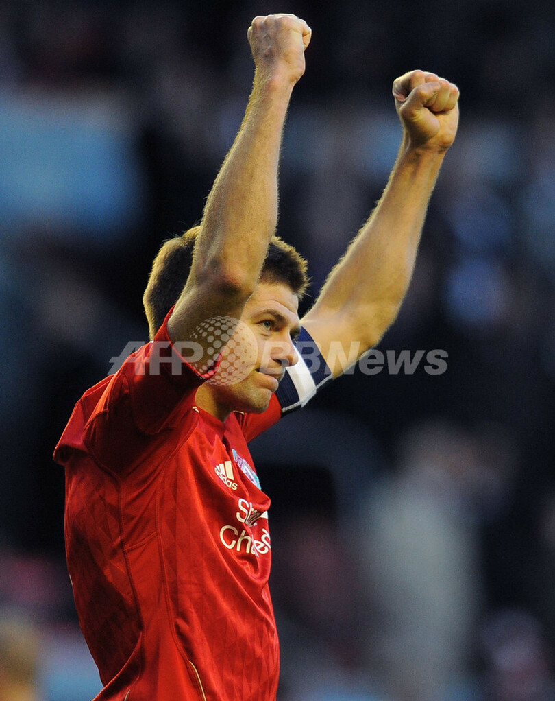 試合に勝利し歓喜するリバプールのスティーブン・ジェラード(Steven Gerrard、2012年3月18日撮影)。(c)AFP/ANDREW YATES