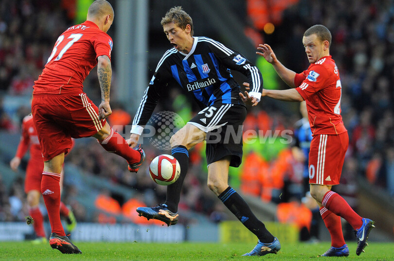 前半23分にルイス・スアレス(Luis Suarez)のゴールで先制したリバプールは、直後の同26分にストーク・シティのピーター・クラウチ(Peter Crouch)に同点ゴールを許したものの、後半12分にスチュワート・ダウニング(Stewart Downing)が決勝点を奪い、本拠地アンフィールド(Anfield)で勝利を収めた。(c)AFP