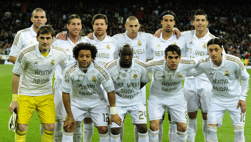 肝移植手術を受けることを発表したFCバルセロナ(FC Barcelona)のエリック・アビダル(Eric Abidal)へのメッセージが記されたシャツを着て写真撮影に臨むレアル・マドリードの選手(2012年3月18日撮影)。(c)AFP/JAVIER SORIANO