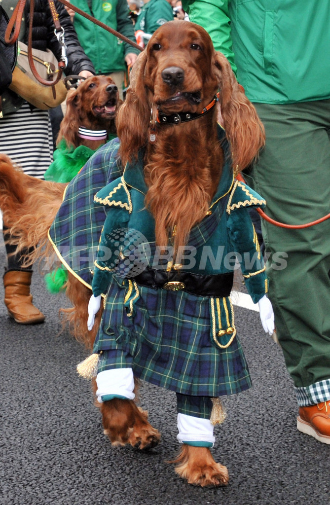 写真は、都内で行われたパレードに緑色の衣装で参加したアイリッシュセッター。東京でのセント・パトリック・デーパレードには1000人を超える人々が参加した(2012年3月18日撮影)。(c)AFP/ Yoshikazu TSUNO