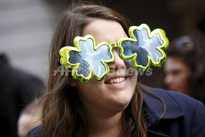 写真は、英ロンドン(London)で行われたパレードに、アイルランドの国花シャムロック(三つ葉)をかたどった眼鏡をかけて参加する女性(2012年3月18日撮影)。(c)AFP/JUSTIN TALLIS