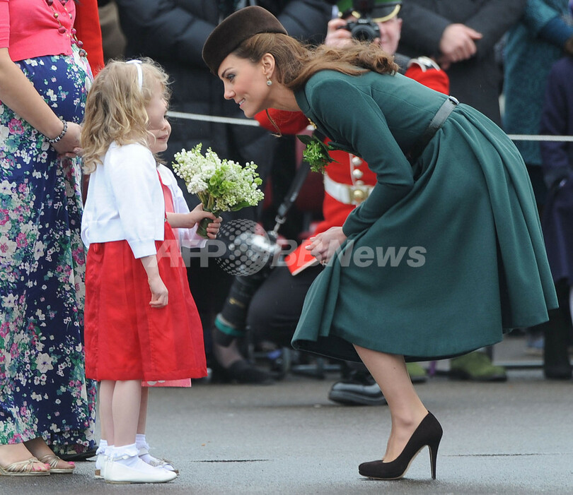 同連隊は、キャサリン妃の夫のウィリアム王子(Prince William)が名誉隊長を務める。軍の行事にキャサリン妃が単独で出席するのは初めて。写真は、セレモニーで少女に話しかけるキャサリン妃(2012年3月17日撮影)。(c)AFP/ PAUL VICENTE