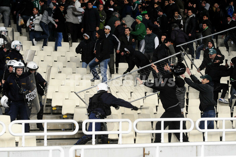 【3月19日 AFP】ギリシャの首都アテネ(Athens)で18日に行われたサッカーギリシャ1部リーグ第25節の試合で暴動が発生し、オリンピアコス(Olympiacos)とパナシナイコス(Panathinaikos)によるギリシャ・ダービーは中止になった。