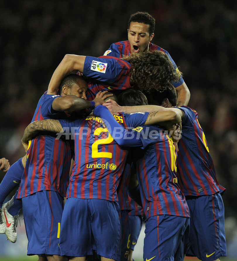 チームの得点に歓喜するFCバルセロナの選手(2012年3月20日撮影)。(c)AFP/LLUIS GENE