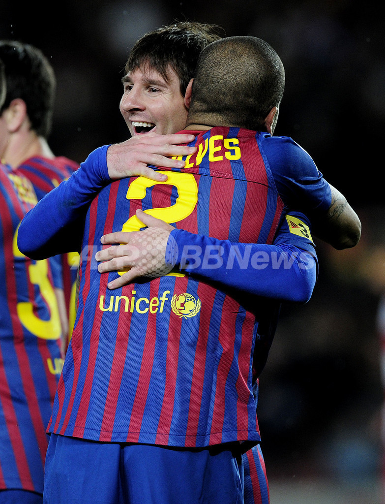 得点を挙げてチームメイトのダニエル・アルヴェス(Daniel Alves)と喜びを分かち合うFCバルセロナのリオネル・メッシ(2012年3月20日撮影)。(c)AFP/JOSEP LAGO