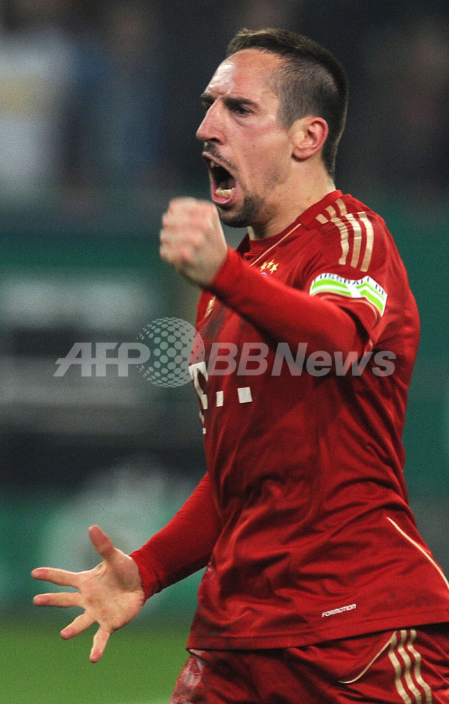 PK戦を制し歓喜するバイエルン・ミュンヘンのフランク・リベリ(Franck Ribery、2012年3月21日撮影)。(c)AFP/PATRIK STOLLARZ
