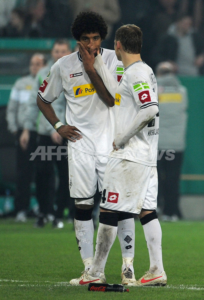 PK戦に敗れ落胆するボルシア・メンヘングラッドバッハのボンフィム・ダンテ(Dante Bonfim Costa Santos、2012年3月21日撮影)。(c)AFP/PATRIK STOLLARZ
