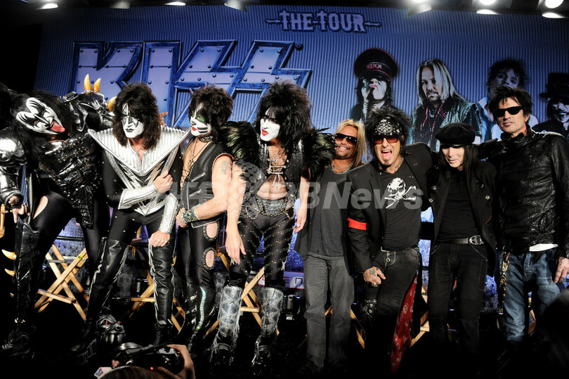 【3月21日 AFP】米ロックバンドのキッス(KISS)とモトリー・クルー(Motley Crue)は20日、7~9月に大規模なツアーを共同で開催すると、米カリフォルニア(California)州ロサンゼルス(Los Angeles)のハリウッド・ルーズベルト・ホテル(Hollywood Roosevelt Hotel)にて発表した。(c)AFP/Getty Images