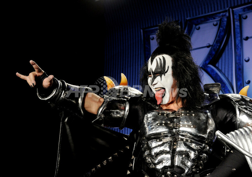 写真は記者会見に登場したキッスのメンバー、ジーン・シモンズ(Gene Simmons、2012年3月20日撮影)。(c)AFP/Getty Images/Kevin Winter