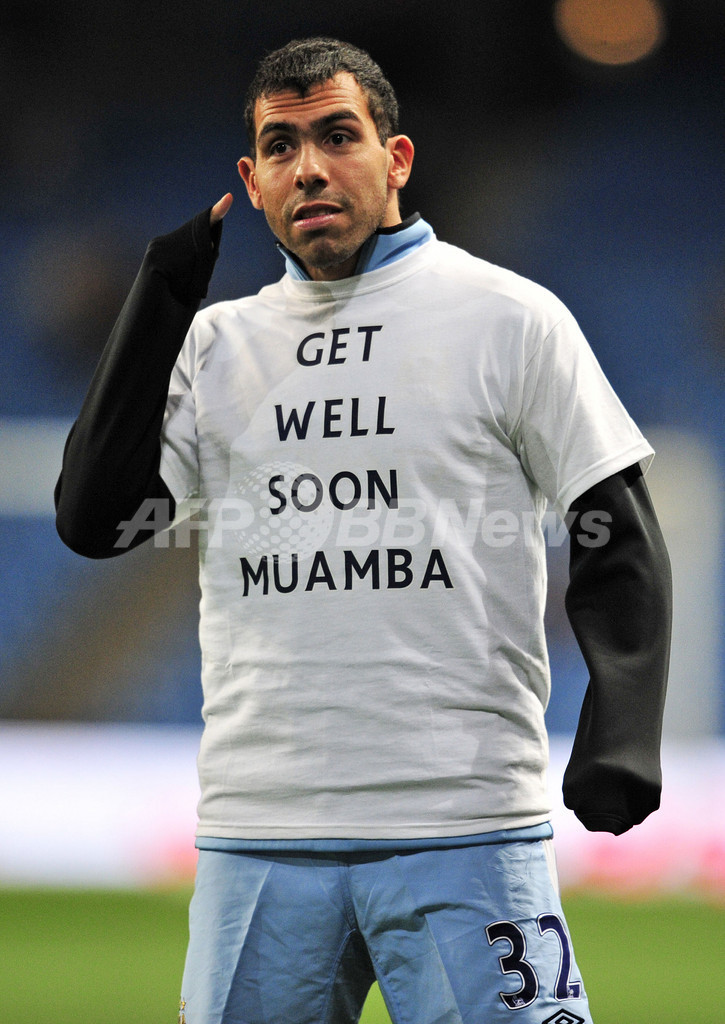 ボルトン・ワンダラーズ(Bolton Wanderers)のファブリス・ムアンバ(Fabrice Muamba)へのメッセージが記されたTシャツを着けて試合前の練習に臨むマンチェスター・シティのカルロス・テベス(Carlos Tevez、2012年3月21日撮影)。(c)AFP/GLYN KIRK
