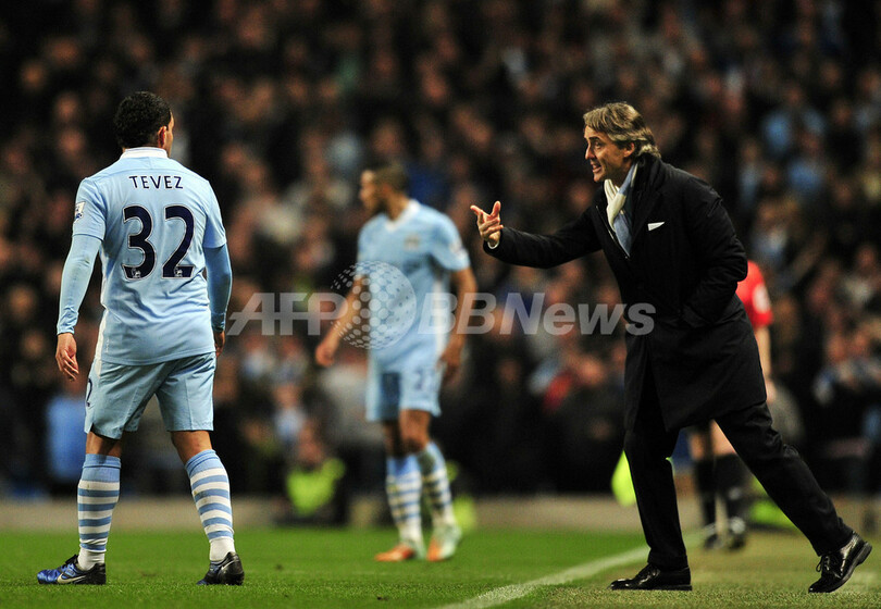 カルロス・テベス(Carlos Tevez)に指示を出すマンチェスター・シティのロベルト・マンチーニ(Roberto Mancini)監督(2012年3月21日撮影)。(c)AFP/ANDREW YATES