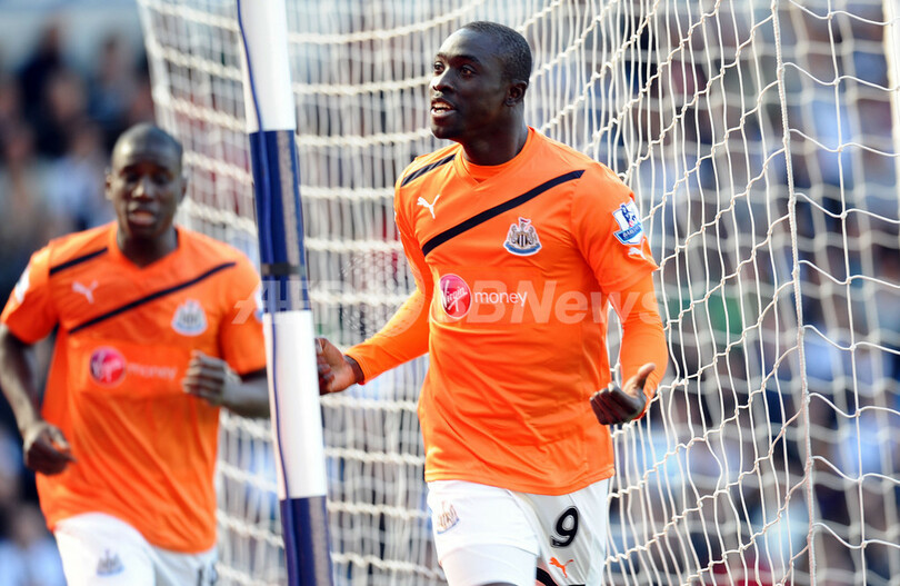 ゴールを喜ぶニューカッスルのパピス・シセ(Papiss Cisse、右、2012年3月25日撮影)。(c)AFP/PAUL ELLIS