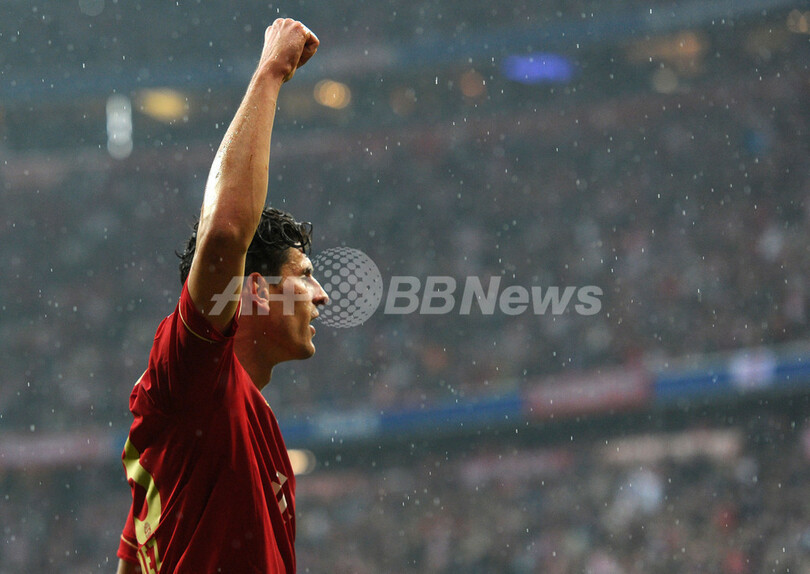 後半23分に追加点を挙げ、ガッツポーズを見せるバイエルン・ミュンヘンのマリオ・ゴメス(Mario Gomez、2012年3月24日撮影)。(c)AFP/CHRISTOF STACHE
