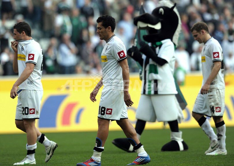 試合に敗れ、落胆した様子でピッチを後にするボルシア・メンヘングラッドバッハの選手(2012年3月24日撮影)。(c)AFP/FEDERICO GAMBARINI