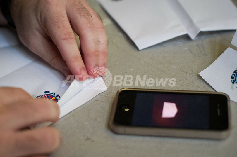 写真はスマートフォンでネットの説明を見ながら紙飛行機を作る参加者(2012年3月21日撮影)。(c)AFP/Yasuyoshi CHIBA