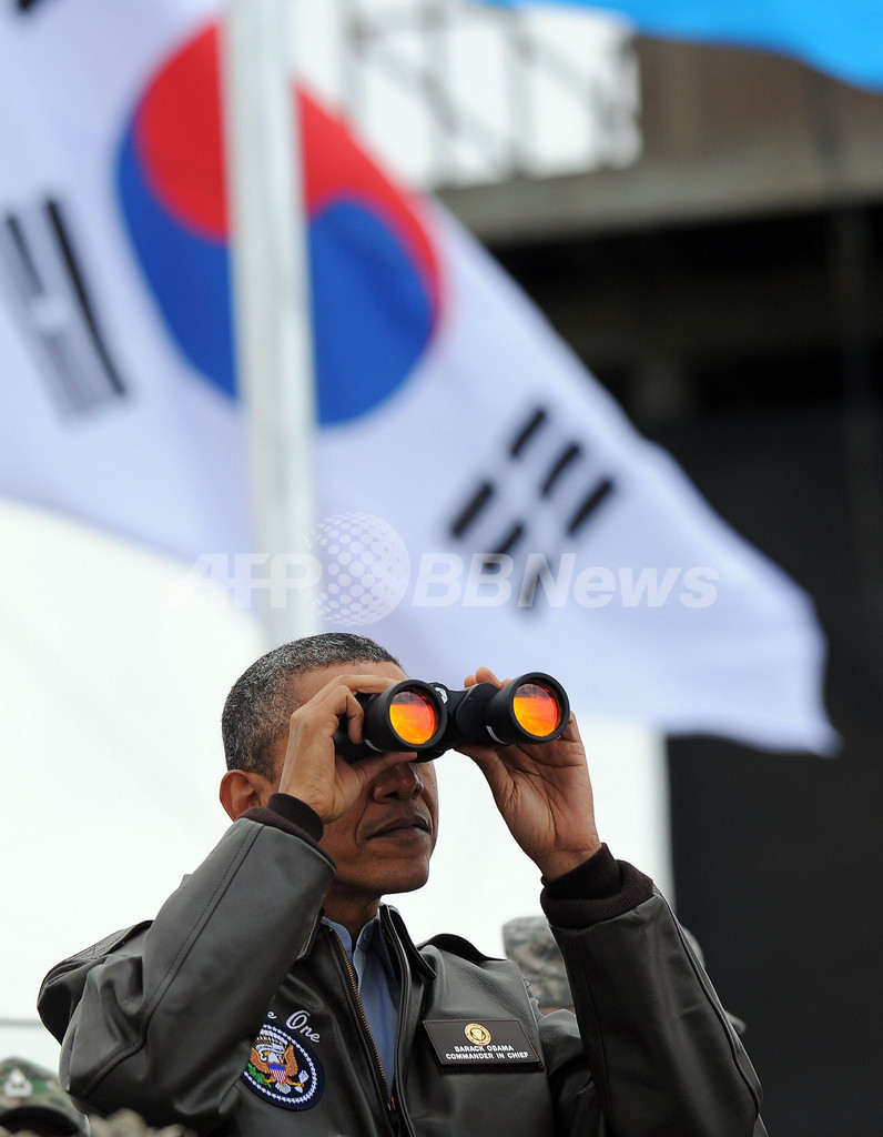 【3月25日 AFP】(写真追加)バラク・オバマ(Barack Obama)米大統領は25日、韓国を訪れ、北朝鮮との軍事境界線がある非武装地帯(DMZ)内の共同警備区域(Joint Security AreaJSA)を視察した。(c)AFP